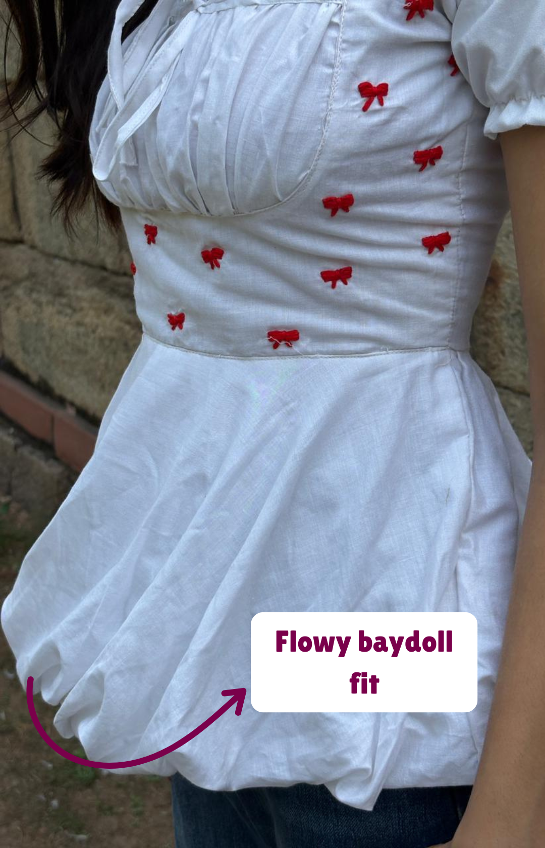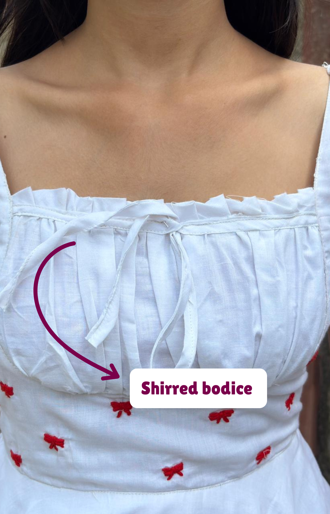 Introducing ‘The Eira top and this top is a celebration of that simple, patient craft. Dozens of delicate, hand-embroidered bows dance across the softest white cotton. It features a comfortable shirred bodice, an elegant square neckline, and dainty puff sleeves. It’s pure, simple, and handcrafted just for you