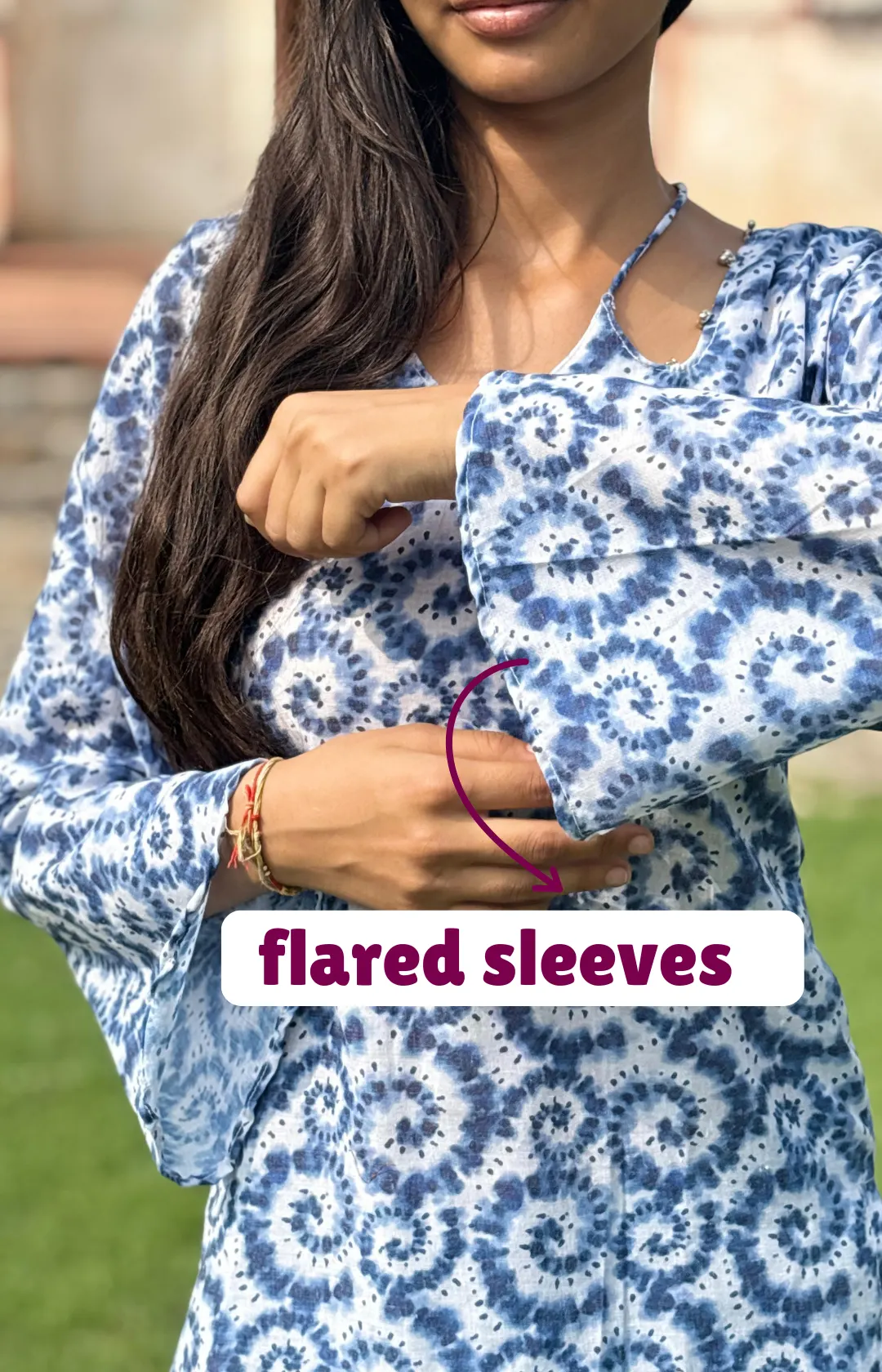 This dreamy blue cotton kurti features a cloudy Shibori print, a modern Keyhole V-Neck, and breezy, flared statement sleeves. Light, comfortable, and stylish, it’s the perfect effortless silhouette for sunny days.