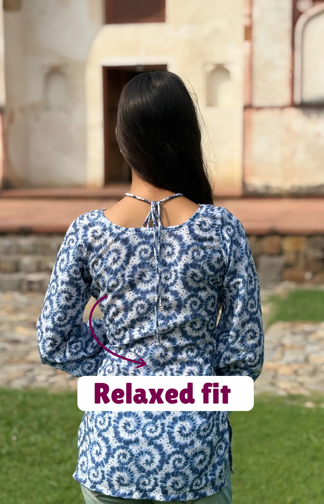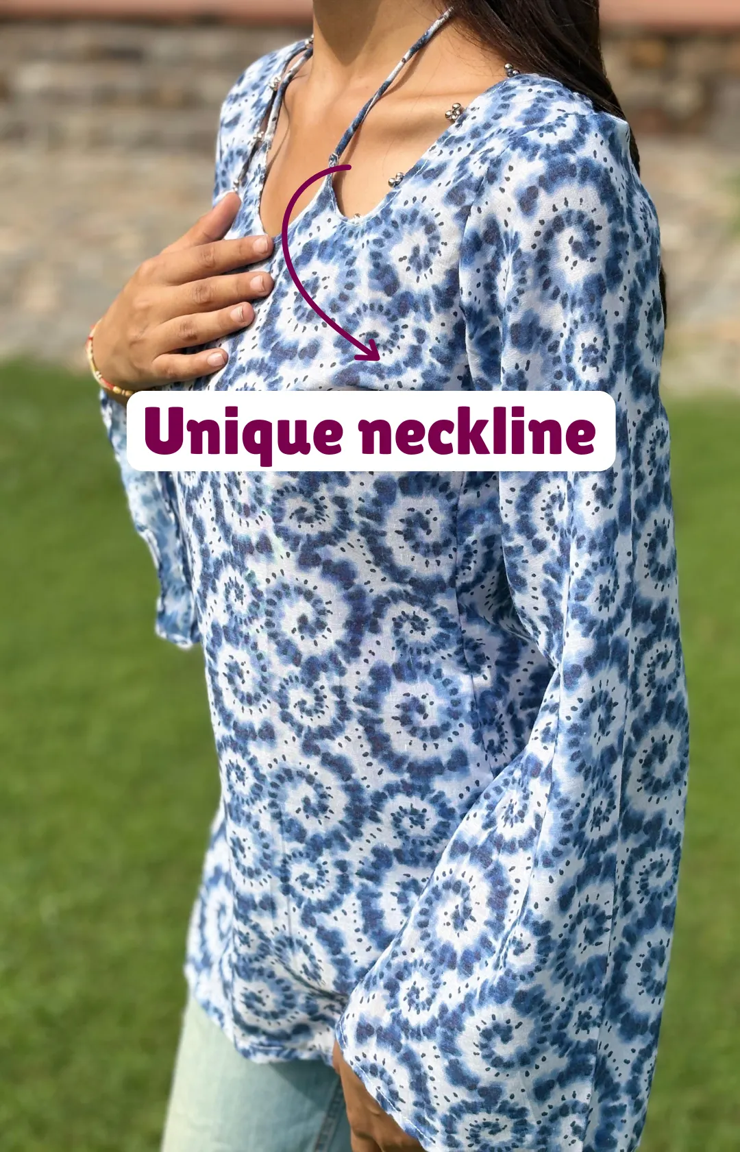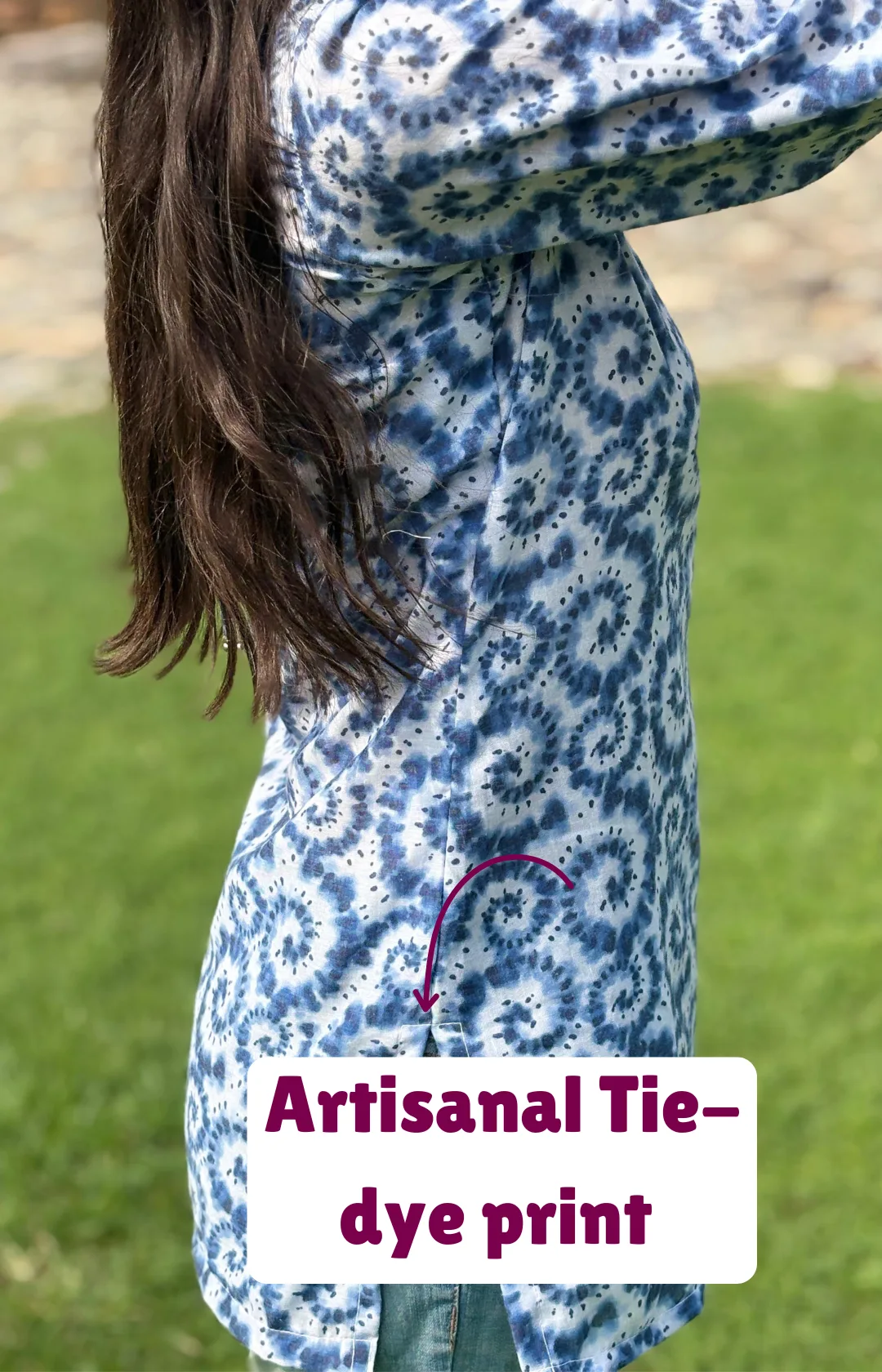 A dreamy blue cotton kurti, brought to life with an artisanal Shibori print reminiscent of a cloudy sky. The unique Keyhole V-Neck adds a touch of modern design, while the flared statement sleeves create a breezy, effortless silhouette. Light, comfortable, and endlessly stylish, this piece is your perfect companion for sunny days