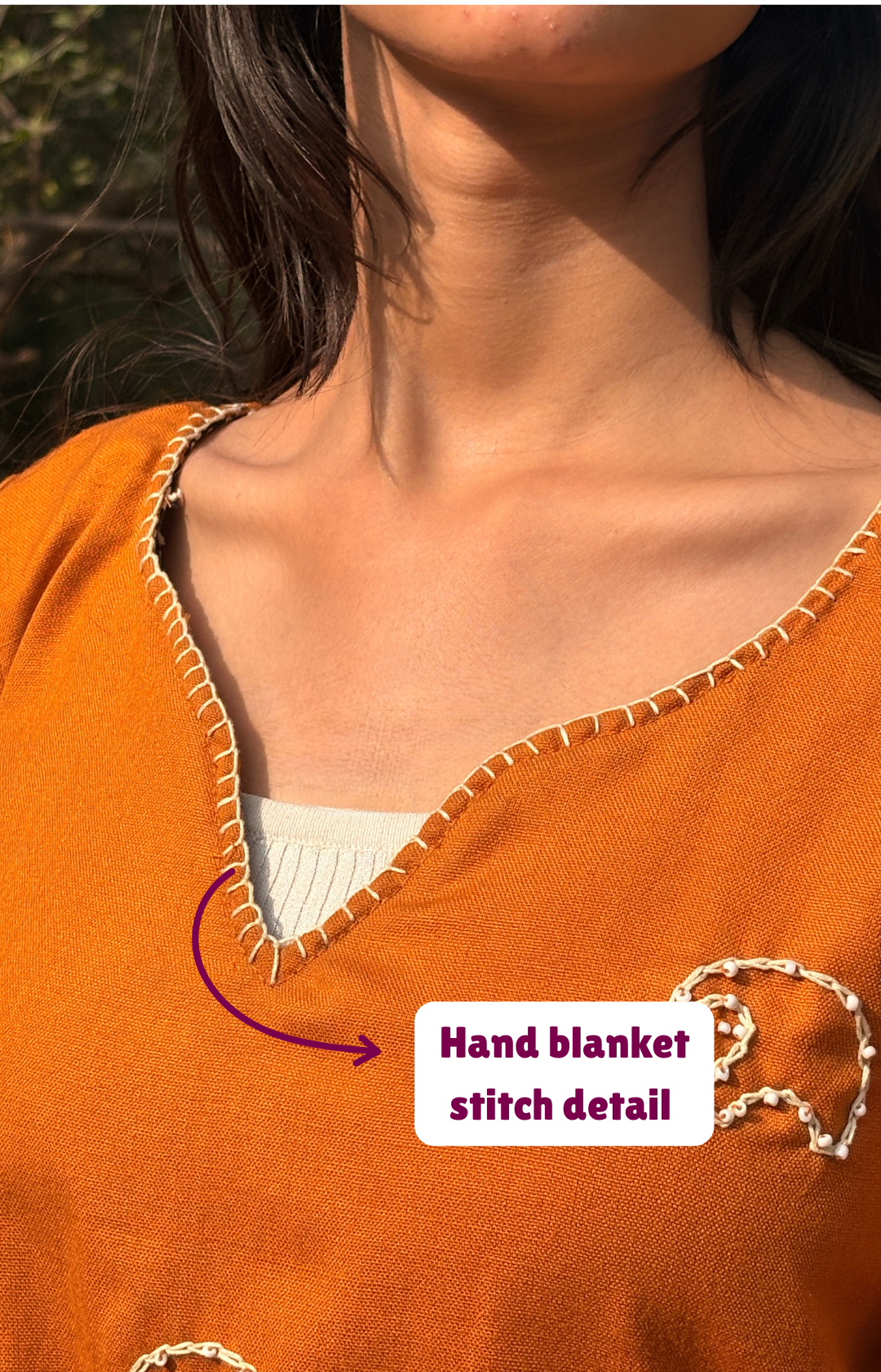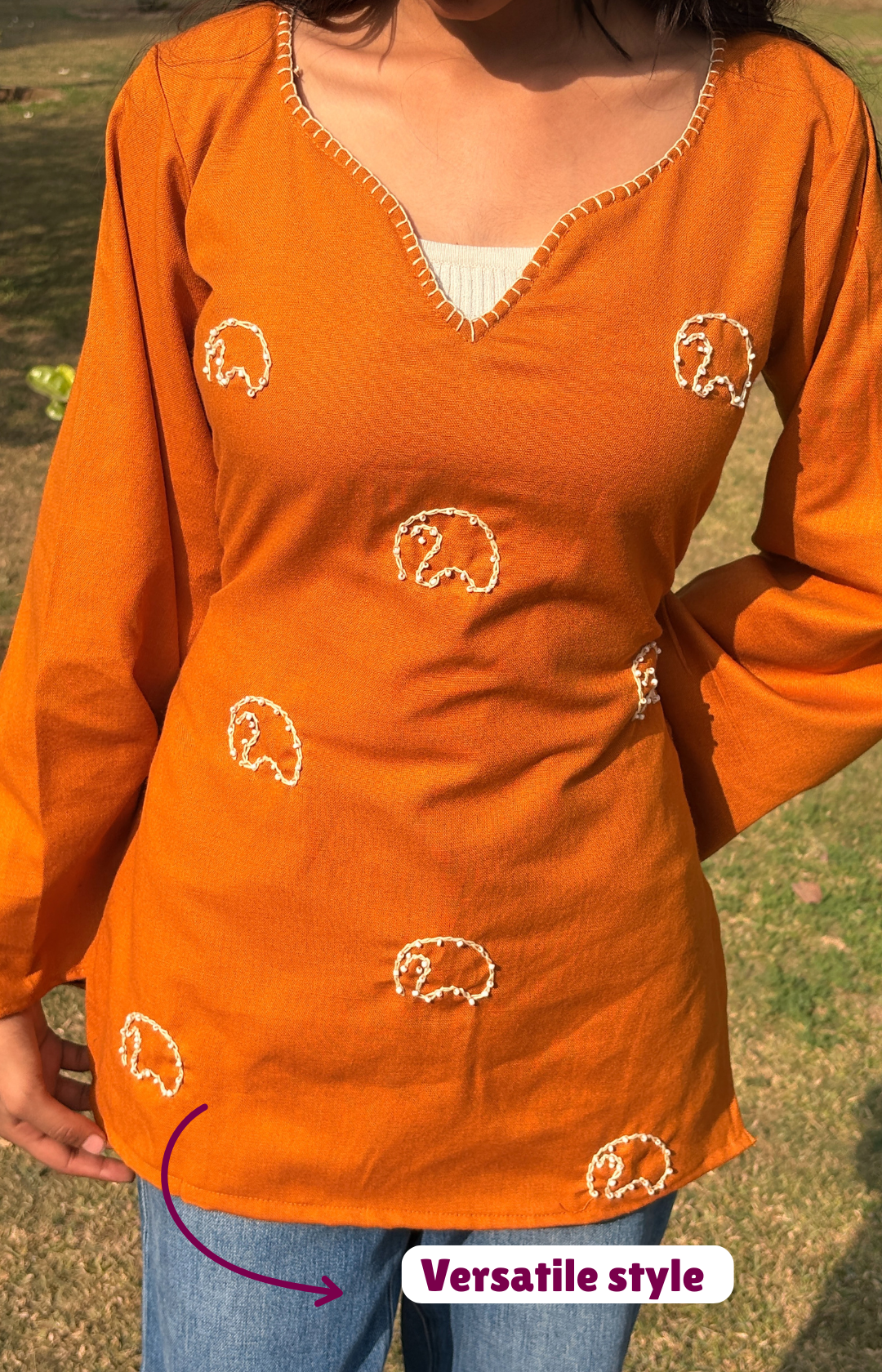 + Free ShippingThis winter ‘Zoya Kurti’ is a perfect option for you if you are looking for a perfect blend of comfort, simplicity, and handcrafted beauty. Made from lightweight and breathable fabric, this kurti is designed for all-day ease without compromising on style. The elegant V-neckline and wide bell sleeves add a graceful flow, while the delicate hand-embroidered motifs give it a unique artisanal touch.